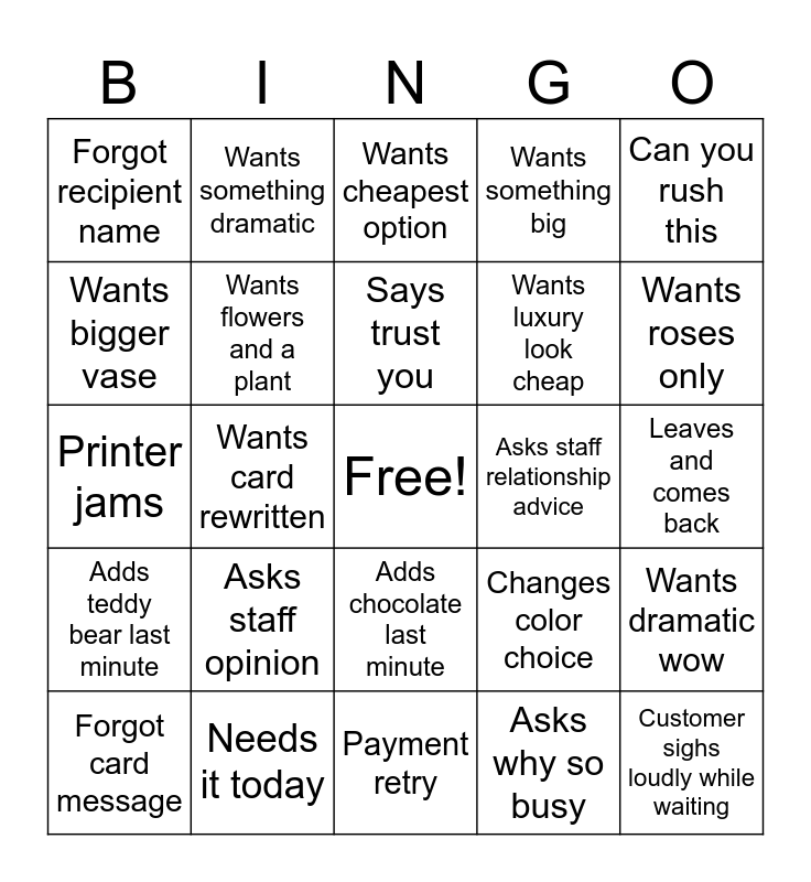 This bingo card has a free space and 81 words: I forgot it was Valentine’s Day, Anything red and cheap, Can you rush this, Out of roses comment, Do you take Apple Pay, Is this enough, She likes pink. I think, Wants picture exact, Needs it today, Wants biggest arrangement, Wants teddy bear, Wants under budget, Wants roses only, Wants something dramatic, Wants unique look, Wants bigger vase, Wants handwritten card, Wants same as last year, Wants same as photo, Wants luxury look cheap, Wants romantic fast, Wants cheapest option, Wants dramatic wow, Wants flowers and a plant, Wants something big, Someone asks if this counts as romantic, Walks in before closing, Walks in late, Walks in sweating, Walks in panicked, Leaves and comes back, Changes mind twice, Changes color choice, Adds teddy bear last minute, Adds chocolate last minute, Adds balloon last minute, Needs it now, Needs delivery now, Needs same day, Needs it in one hour, Customer sighs loudly while waiting, Forgot card message, Card message too long, Card message gets changed after printing, Wants card rewritten, Misspells name, Forgot recipient name, Forgot address, Forgot phone number, Payment decline, Payment retry, Tap to pay fails, Out of cash, Change delivery address, Changes delivery time, Delivery reroute, Delivery driver calls, Delivery driver lost, Delivery driver confused, Phone rings nonstop, Printer jams, Printer low ink, Printer error, Cooler door open again, Cooler packed, Cooler chaos, Coffee untouched, Coffee cold, Watching design closely, Phone on speaker, Calls partner from counter, Asks staff opinion, Asks staff relationship advice, Asks where to park, Asks store hours, Asks how long flowers last, Asks what men buy, Asks why so busy, Says saw you on Facebook, Says trust you and Says you saved me.
