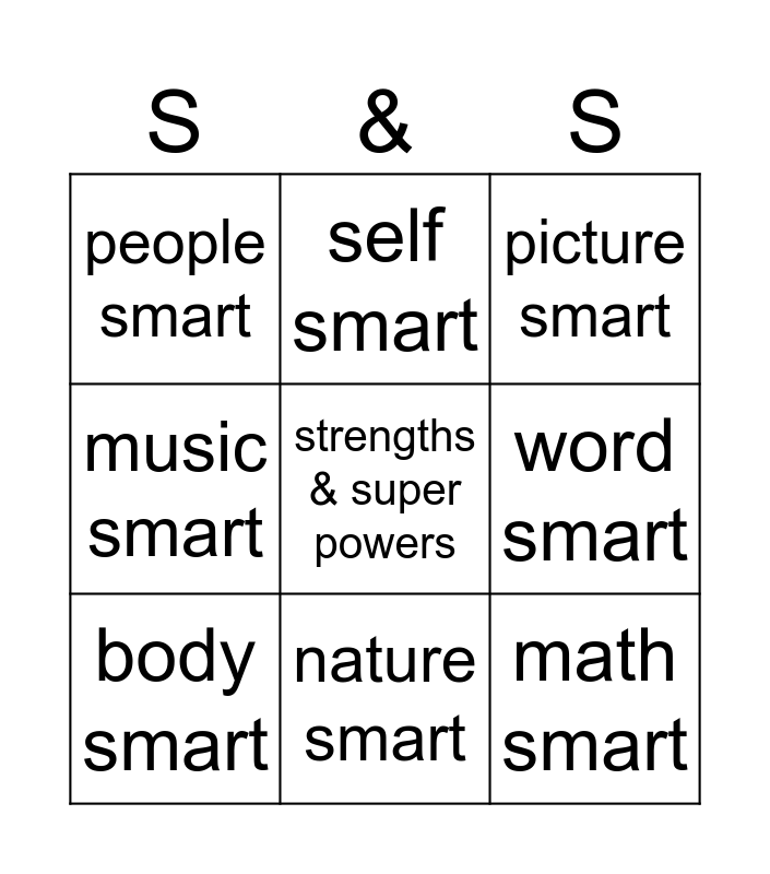 This bingo card has a free space and 8 words: music smart, self smart, word smart, body smart, picture smart, people smart, nature smart and math smart.