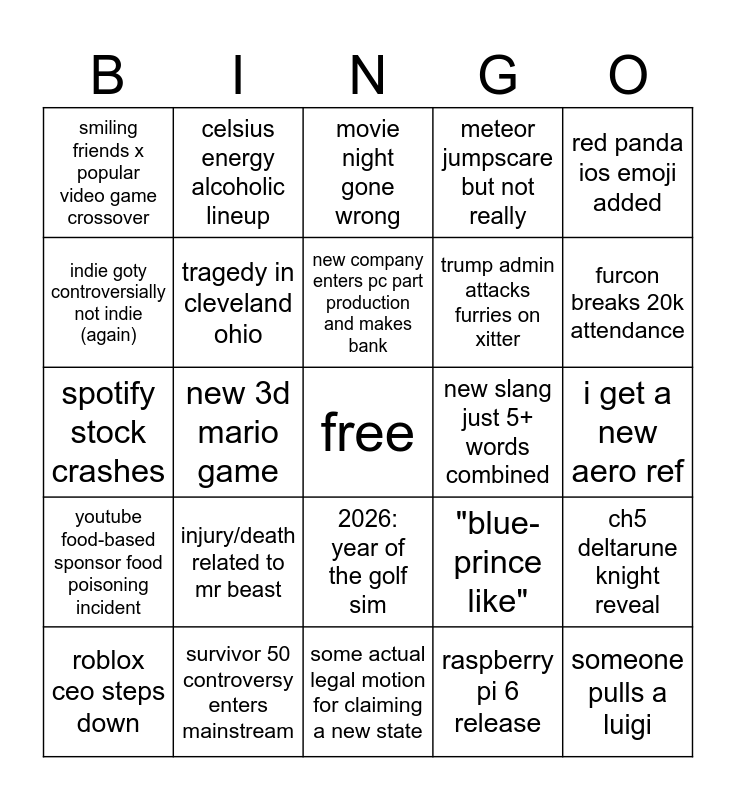 This bingo card has a free space and 24 words: injury/death related to mr beast, survivor 50 controversy enters mainstream, new company enters pc part production and makes bank, roblox ceo steps down, red panda ios emoji added, smiling friends x popular video game crossover, indie goty controversially not indie (again), celsius energy alcoholic lineup, new slang just 5+ words combined, 2026: year of the golf sim, trump admin attacks furries on xitter, spotify stock crashes, "blue-prince like", ch5 deltarune knight reveal, tragedy in cleveland ohio, raspberry pi 6 release, i get a new aero ref, movie night gone wrong, furcon breaks 20k attendance, new 3d mario game, someone pulls a luigi, youtube food-based sponsor food poisoning incident, meteor jumpscare but not really and some actual legal motion for claiming a new state.