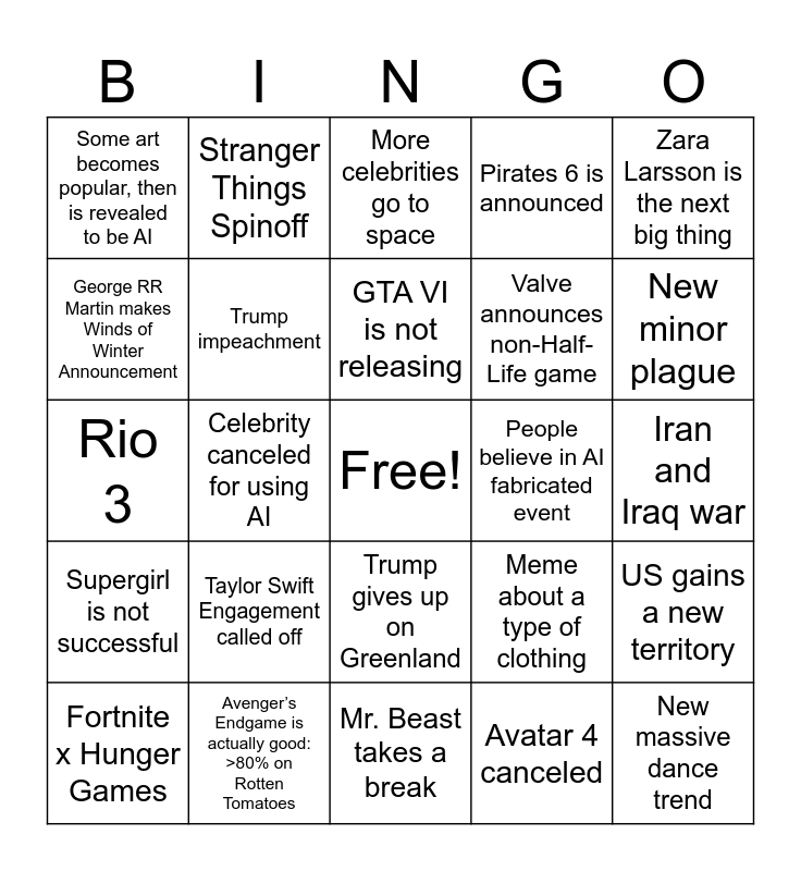 This bingo card has a free space and 24 words: Taylor Swift Engagement called off, Avenger’s Endgame is actually good: >80% on Rotten Tomatoes, GTA VI is not releasing, Fortnite x Hunger Games, Zara Larsson is the next big thing, Some art becomes popular, then is revealed to be AI, George RR Martin makes Winds of Winter Announcement, Stranger Things Spinoff, People believe in AI fabricated event, Trump gives up on Greenland, Valve announces non-Half-Life game, Rio 3, Meme about a type of clothing, US gains a new territory, Trump impeachment, Avatar 4 canceled, Iran and Iraq war, More celebrities go to space, New minor plague, Celebrity canceled for using AI, New massive dance trend, Supergirl is not successful, Pirates 6 is announced and Mr. Beast takes a break.