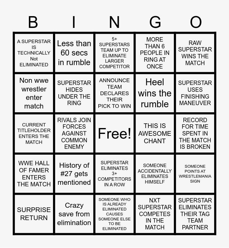 This bingo card has a free space and 24 words: History of #27 gets mentioned, Crazy save from elimination, ANNOUNCE TEAM DECLARES THEIR PICK TO WIN, SURPRISE RETURN, RAW SUPERSTAR WINS THE MATCH, A SUPERSTAR IS TECHNICALLY Not ELIMINATED, Non wwe wrestler enter match, Less than 60 secs in rumble, THIS IS AWESOME CHANT, SUPERSTAR ELIMINATES 3+ COMPETITORS IN A ROW, Heel wins the rumble, CURRENT TITLEHOLDER ENTERS THE MATCH, SOMEONE ACCIDENTALLY ELIMINATES HIMSELF, SOMEONE POINTS AT WRESTLEMANIA SIGN, SUPERSTAR HIDES UNDER THE RING, NXT SUPERSTAR COMPETES IN THE MATCH, RECORD FOR TIME SPENT IN THE MATCH IS BROKEN, 5+ SUPERSTARS TEAM UP TO ELIMINATE LARGER COMPETITOR, SUPERSTAR USES FINISHING MANEUVER, RIVALS JOIN FORCES AGAINST COMMON ENEMY, SUPERSTAR ELIMINATES THEIR TAG TEAM PARTNER, WWE HALL OF FAMER ENTERS THE MATCH, MORE THAN 6 PEOPLE IN RING AT ONCE and SOMEONE WHO IS ALREADY ELIMINATED CAUSES SOMEONE ELSE TO BE ELIMINATED.