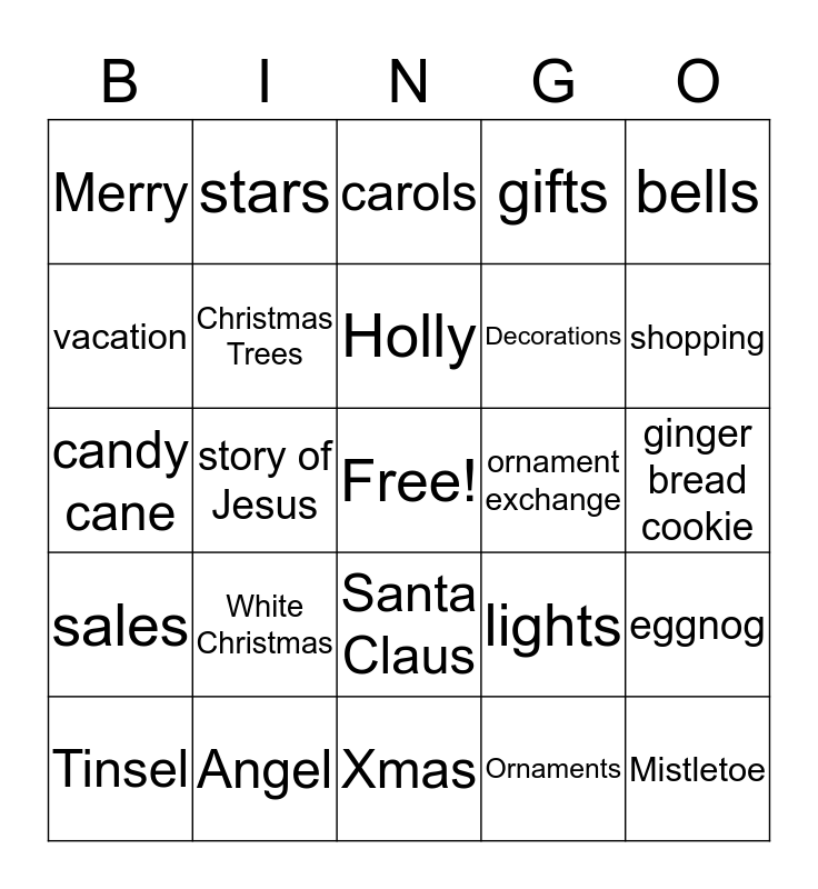 This bingo card has a free space and 24 words: White Christmas, Angel, Holly, Tinsel, bells, Merry, vacation, stars, ornament exchange, Santa Claus, Decorations, candy cane, lights, eggnog, Christmas Trees, Ornaments, ginger bread cookie, carols, shopping, story of Jesus, Mistletoe, sales, gifts and Xmas.