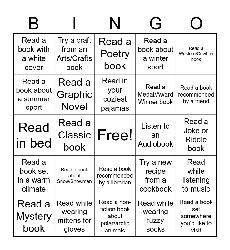 This bingo card has a free space and 24 words: Read a book about Snow/Snowmen, Read while wearing mittens for gloves, Read in your coziest pajamas, Read a Mystery book, Read a Western/Cowboy book, Read a book with a white cover, Read a book about a summer sport, Try a craft from an Arts/Crafts book, Listen to an Audiobook, Read a book recommended by a librarian, Read a Medal/Award Winner book, Read in bed, Try a new recipe from a cookbook, Read while listening to music, Read a Graphic Novel, Read while wearing fuzzy socks, Read a Joke or Riddle book, Read a Poetry book, Read a book recommended by a friend, Read a Classic book, Read a book set somewhere you’d like to visit, Read a book set in a warm climate, Read a book about a winter sport and Read a non-fiction book about polar/arctic animals.