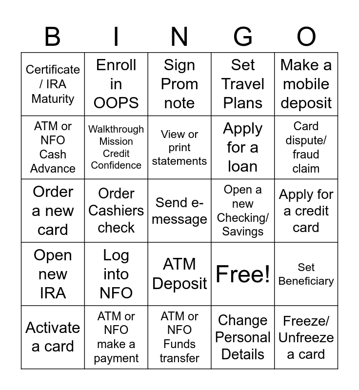 This bingo card has 25 words: Log into NFO, ATM or NFO Funds transfer, View or print statements, Activate a card, Make a mobile deposit, Certificate / IRA Maturity, ATM or NFO Cash Advance, Enroll in OOPS, Open a new Checking/ Savings, ATM Deposit, Apply for a loan, Order a new card, Free!, Set Beneficiary, Walkthrough Mission Credit Confidence, Freeze/ Unfreeze a card, Apply for a credit card, Sign Prom note, Card dispute/ fraud claim, Order Cashiers check, Send e-message, ATM or NFO make a payment, Open new IRA, Set Travel Plans and Change Personal Details.