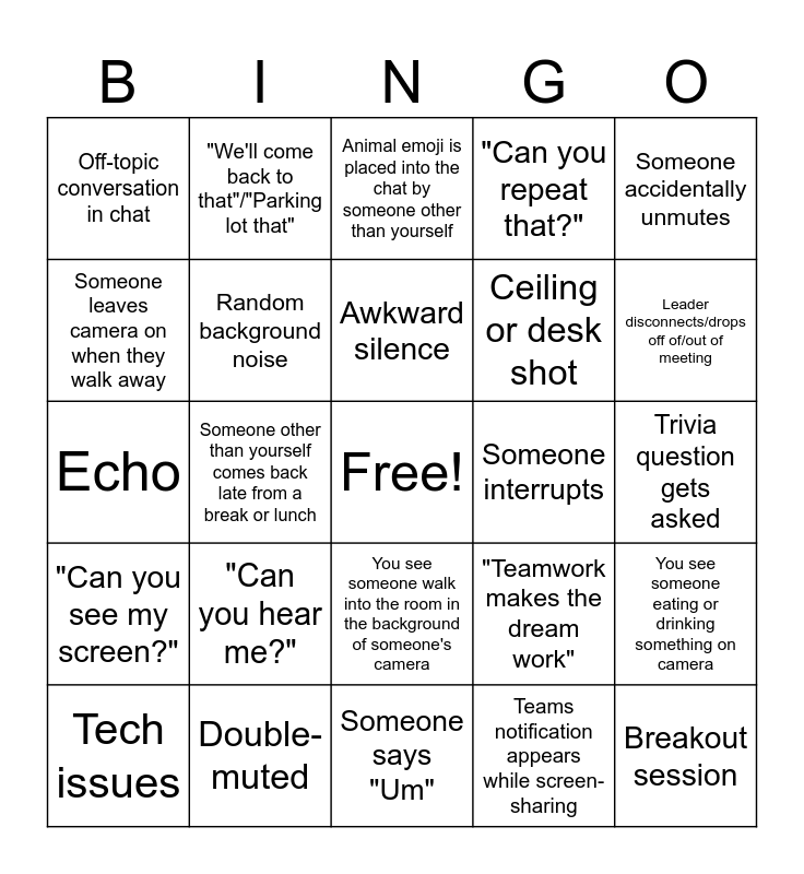 This bingo card has a free space and 24 words: "Can you hear me?", Double-muted, Awkward silence, Tech issues, Someone accidentally unmutes, Off-topic conversation in chat, Someone leaves camera on when they walk away, "We'll come back to that"/"Parking lot that", Someone interrupts, You see someone walk into the room in the background of someone's camera, Ceiling or desk shot, Echo, "Teamwork makes the dream work", You see someone eating or drinking something on camera, Random background noise, Teams notification appears while screen-sharing, Trivia question gets asked, Animal emoji is placed into the chat by someone other than yourself, Leader disconnects/drops off of/out of meeting, Someone other than yourself comes back late from a break or lunch, Breakout session, "Can you see my screen?", "Can you repeat that?" and Someone says "Um".