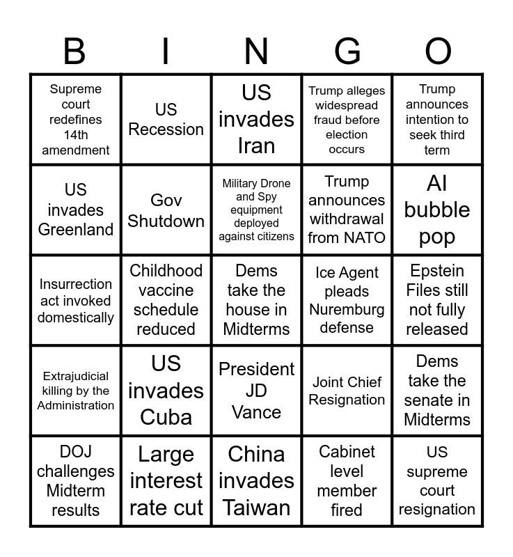 This bingo card has a free space and 24 words: US invades Cuba, Large interest rate cut, Military Drone and Spy equipment deployed against citizens, DOJ challenges Midterm results, Trump announces intention to seek third term, Supreme court redefines 14th amendment, US invades Greenland, US Recession, Ice Agent pleads Nuremburg defense, President JD Vance, Trump announces withdrawal from NATO, Insurrection act invoked domestically, Joint Chief Resignation, Dems take the senate in Midterms, Gov Shutdown, Cabinet level member fired, Epstein Files still not fully released, US invades Iran, AI bubble pop, Childhood vaccine schedule reduced, US supreme court resignation, Extrajudicial killing by the Administration, Trump alleges widespread fraud before election occurs and China invades Taiwan.