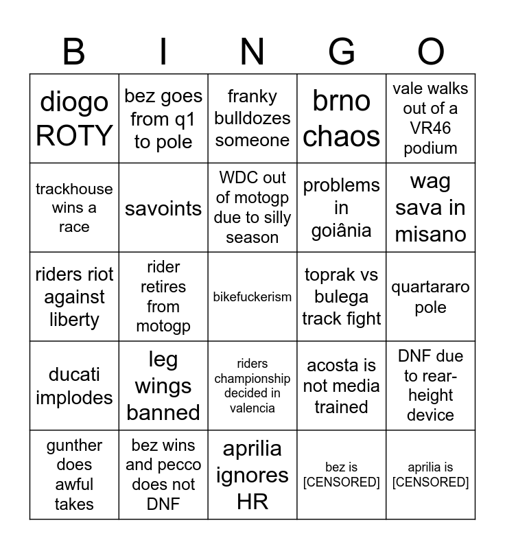 This bingo card has 25 words: leg wings banned, aprilia ignores HR, WDC out of motogp due to silly season, gunther does awful takes, vale walks out of a VR46 podium, diogo ROTY, trackhouse wins a race, bez goes from q1 to pole, toprak vs bulega track fight, riders championship decided in valencia, problems in goiânia, riders riot against liberty, acosta is not media trained, DNF due to rear-height device, savoints, aprilia is [CENSORED], quartararo pole, franky bulldozes someone, wag sava in misano, rider retires from motogp, bikefuckerism, bez wins and pecco does not DNF, ducati implodes, brno chaos and bez is [CENSORED].