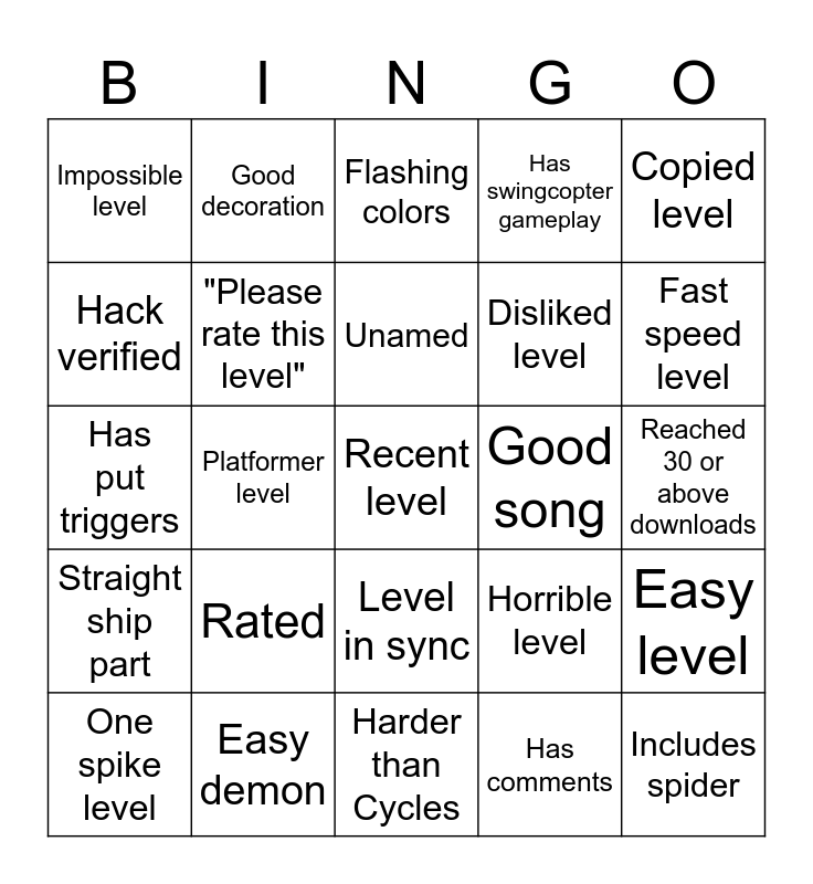 This bingo card has a free space and 24 words: Rated, Easy demon, Unamed, One spike level, Copied level, Impossible level, Hack verified, Good decoration, Good song, Level in sync, Disliked level, Has put triggers, Horrible level, Easy level, "Please rate this level", Has comments, Reached 30 or above downloads, Flashing colors, Fast speed level, Platformer level, Includes spider, Straight ship part, Has swingcopter gameplay and Harder than Cycles.