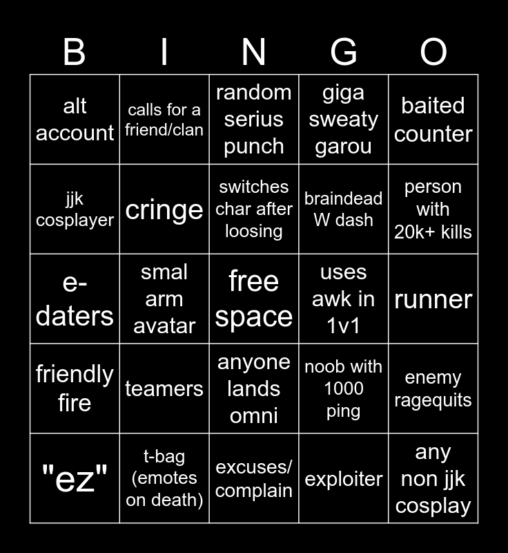 This bingo card has a free space and 24 words: teamers, t-bag (emotes on death), switches char after loosing, "ez", baited counter, alt account, jjk cosplayer, calls for a friend/clan, uses awk in 1v1, anyone lands omni, braindead W dash, e-daters, noob with 1000 ping, enemy ragequits, cringe, exploiter, runner, random serius punch, person with 20k+ kills, smal arm avatar, any non jjk cosplay, friendly fire, giga sweaty garou and excuses/ complain.