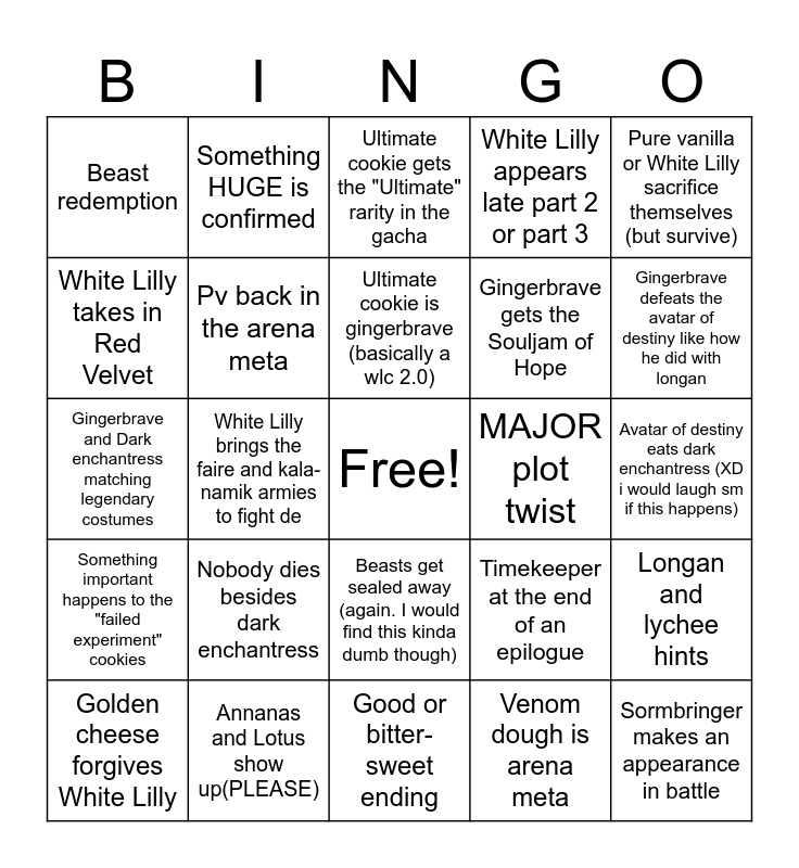 This bingo card has a free space and 24 words: Nobody dies besides dark enchantress, Annanas and Lotus show up(PLEASE), Ultimate cookie is gingerbrave (basically a wlc 2.0), Golden cheese forgives White Lilly, Pure vanilla or White Lilly sacrifice themselves (but survive), Beast redemption, White Lilly takes in Red Velvet, Something HUGE is confirmed, MAJOR plot twist, Beasts get sealed away (again. I would find this kinda dumb though), Gingerbrave gets the Souljam of Hope, Gingerbrave and Dark enchantress matching legendary costumes, Timekeeper at the end of an epilogue, Longan and lychee hints, Pv back in the arena meta, Venom dough is arena meta, Avatar of destiny eats dark enchantress (XD i would laugh sm if this happens), Ultimate cookie gets the "Ultimate" rarity in the gacha, Gingerbrave defeats the avatar of destiny like how he did with longan, White Lilly brings the faire and kala-namik armies to fight de, Sormbringer makes an appearance in battle, Something important happens to the "failed experiment" cookies, White Lilly appears late part 2 or part 3 and Good or bitter-sweet ending.