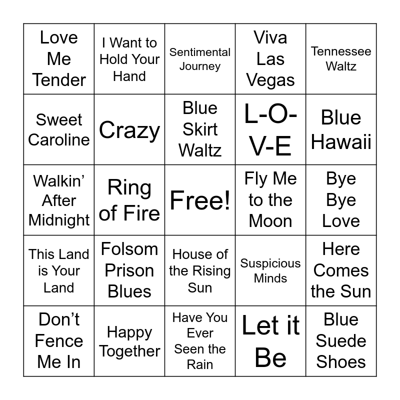 This bingo card has a free space and 40 words: Sunshine on My Shoulders, Walkin’ After Midnight, Country Roads, Crazy, Happy Together, House of the Rising Sun, Blue Skirt Waltz, Blueberry Hill, Tennessee Waltz, This Land is Your Land, Ring of Fire, Viva Las Vegas, Blue Suede Shoes, Bye Bye Love, Fly Me to the Moon, Folsom Prison Blues, Happy Trails, Love Me Tender, Que Sera Sera, Sentimental Journey, Here Comes the Sun, Let it Be, L-O-V-E, Sweet Caroline, Rocky Mountain High, Leaving on a Jet Plane, Delta Dawn, Beer Barrel Polka, Blue Moon, Over the Rainbow, You Are My Sunshine, Don’t Fence Me In, Oh What a Beautiful Mornin’, Suspicious Minds, Blue Hawaii, Have You Ever Seen the Rain, Hooked on a Feeling, Killing Me Softly, I Want to Hold Your Hand and Moon River.