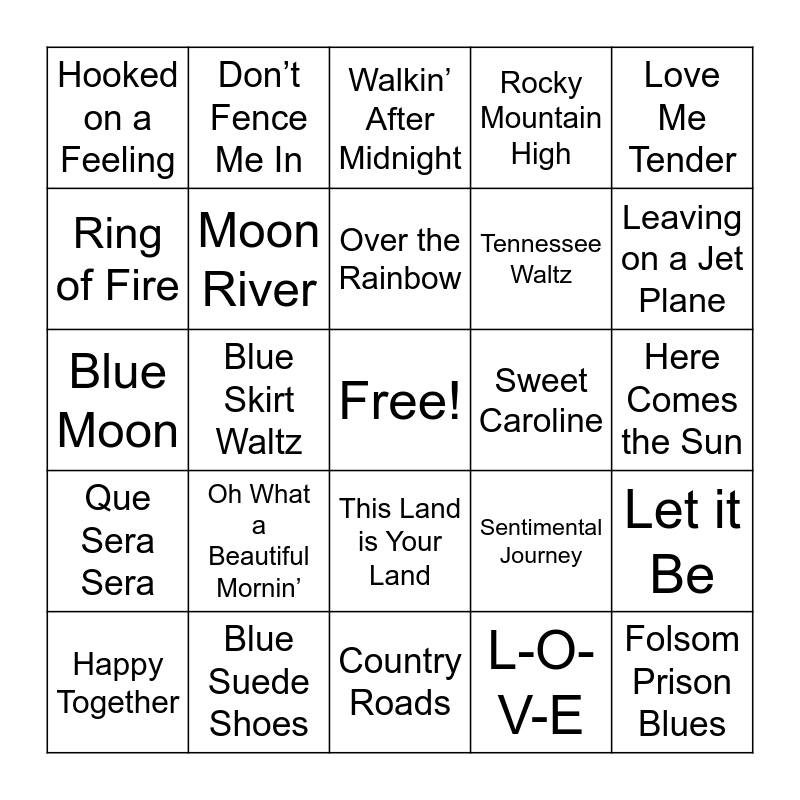 This bingo card has a free space and 40 words: Suspicious Minds, Blue Moon, House of the Rising Sun, Moon River, Blue Suede Shoes, This Land is Your Land, Over the Rainbow, You Are My Sunshine, Love Me Tender, Que Sera Sera, Blue Skirt Waltz, Rocky Mountain High, Folsom Prison Blues, Here Comes the Sun, Sweet Caroline, Oh What a Beautiful Mornin’, Have You Ever Seen the Rain, Hooked on a Feeling, Killing Me Softly, Walkin’ After Midnight, Let it Be, L-O-V-E, Tennessee Waltz, Ring of Fire, Viva Las Vegas, Bye Bye Love, Fly Me to the Moon, Blueberry Hill, Blue Hawaii, Sunshine on My Shoulders, Crazy, Happy Together, Happy Trails, Sentimental Journey, Leaving on a Jet Plane, Country Roads, I Want to Hold Your Hand, Delta Dawn, Don’t Fence Me In and Beer Barrel Polka.