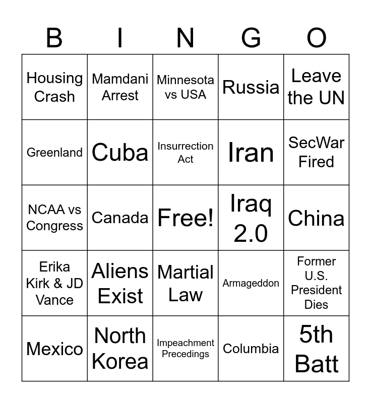 This bingo card has a free space and 24 words: Mexico, Aliens Exist, Insurrection Act, Columbia, Leave the UN, Housing Crash, Mamdani Arrest, Minnesota vs USA, Iraq 2.0, China, NCAA vs Congress, Cuba, Armageddon, Former U.S. President Dies, Greenland, North Korea, Impeachment Precedings, Russia, SecWar Fired, Erika Kirk & JD Vance, Canada, Martial Law, Iran and 5th Batt.