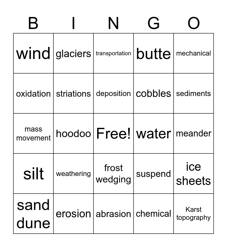 This bingo card has a free space and 24 words: weathering, erosion, deposition, sand dune, mechanical, wind, oxidation, glaciers, water, frost wedging, cobbles, mass movement, suspend, ice sheets, striations, chemical, meander, transportation, sediments, hoodoo, Karst topography, silt, butte and abrasion.