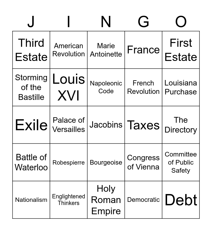 This bingo card has a free space and 24 words: Robespierre, Englightened Thinkers, Napoleonic Code, Nationalism, First Estate, Third Estate, Storming of the Bastille, American Revolution, Taxes, Bourgeoise, French Revolution, Exile, Congress of Vienna, Committee of Public Safety, Louis XVI, Democratic, The Directory, Marie Antoinette, Louisiana Purchase, Palace of Versailles, Debt, Battle of Waterloo, France and Holy Roman Empire.