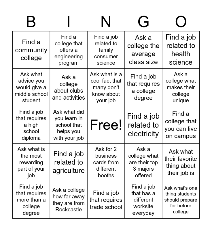 This bingo card has a free space and 24 words: Find a job related to agriculture, Ask a college how far away they are from Rockcastle, Ask what is a cool fact that many don't know about your job, Find a job that requires more than a college degree, Find a job related to health science, Find a community college, Ask what advice you would give a middle school student, Find a college that offers a engineering program, Find a job related to electricity, Ask for 2 business cards from different booths, Find a job that requires a college degree, Find a job that requires a high school diploma, Ask a college what are their top 3 majors offered, Ask what their favorite thing about their job is, Ask a college about clubs and activities, Find a job that has a different worksite everyday, Find a college that you can live on campus, Find a job related to family consumer science, Ask a college what makes their college unique, Ask what did you learn in school that helps you with your job, Ask what's one thing students should prepare for before college, Ask what is the most rewarding part of your job, Ask a college the average class size and Find a job that requires trade school.