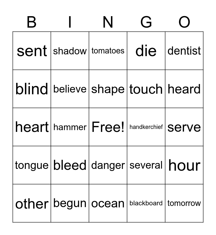 This bingo card has a free space and 30 words: begun, curtain, hammer, nurse, sent, tomatoes, believe, danger, handkerchief, ocean, serve, tomorrow, blackboard, date, heard, office, several, tongue, bleed, dentist, heart, often, shadow, touch, blind, die, hour, other, shape and tough.