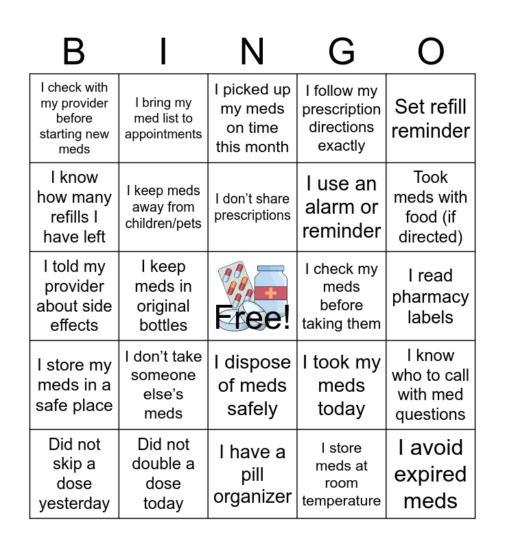 This bingo card has a free space and 27 words: I took my meds today, I took my meds at the same time as yesterday, I use an alarm or reminder, I have a pill organizer, I know how many refills I have left, I picked up my meds on time this month, I bring my med list to appointments, I store my meds in a safe place, I check my meds before taking them, I know who to call with med questions, I told my provider about side effects, I follow my prescription directions exactly, Did not skip a dose yesterday, Did not double a dose today, Took meds with food (if directed), Took meds before leaving home, I keep meds away from children/pets, I don’t share prescriptions, I don’t take someone else’s meds, I check with my provider before starting new meds, I read pharmacy labels, I store meds at room temperature, I keep meds in original bottles, I avoid expired meds, I dispose of meds safely, Set refill reminder and Checked pill supply this week.