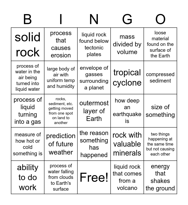 This bingo card has 31 words: Free!, speed at which land moves up, rocks, sediment, etc. getting moved from one spot on land to another, opening in Earth's crust where magma comes out, solid rock, liquid rock found below tectonic plates, large body of air with uniform temp and humidity, rock with valuable minerals, how deep an earthquake is, liquid rock that comes from a volcano, size of something, outermost layer of Earth, energy that shakes the ground, large section of earth (underground) that is constantly moving, compressed sediment, layer between the crust and core, two things happening at the same time but not causing each other, prediction of future weather, measure of how hot or cold something is, the reason something has happened, loose material found on the surface of the Earth, force that attracts an object toward the center of the Earth, ability to do work, process that causes erosion, tropical cyclone, process of water in the air being turned into liquid water, mass divided by volume, process of liquid turning into a gas, process of water falling from clouds to Earth's surface, envelope of gasses surrounding a planet and height above Earth's surface/sea level.