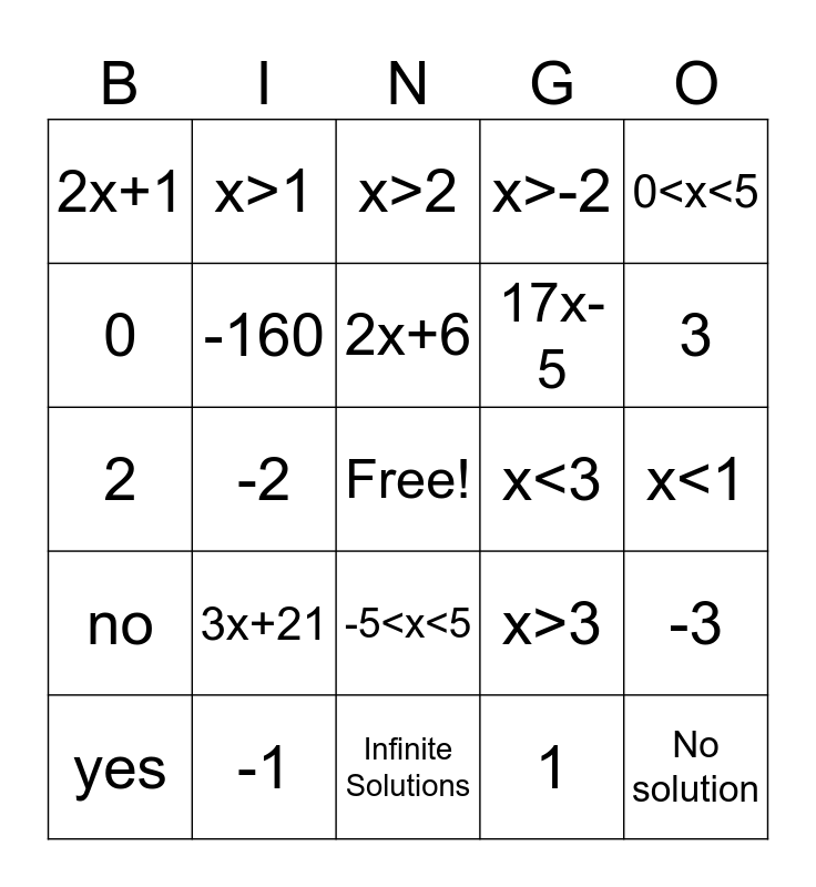 This bingo card has a free space and 24 words: 3x+21, -1, 2x+6, yes, 0<x<5, 2x+1, 0, x>1, x<3, -5<x<5, 17x-5, 2, x>3, -3, -160, 1, x<1, x>2, 3, -2, No solution, no, x>-2 and Infinite Solutions.