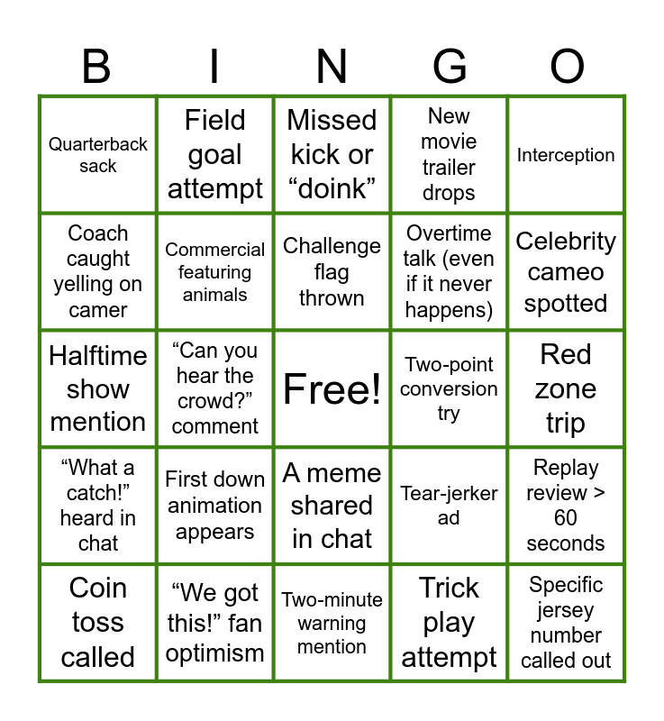 This bingo card has a free space and 24 words: Coin toss called, First down animation appears, Challenge flag thrown, Trick play attempt, Interception, Quarterback sack, Field goal attempt, Missed kick or “doink”, Two‑point conversion try, Red zone trip, Halftime show mention, Commercial featuring animals, Tear‑jerker ad, Replay review > 60 seconds, Coach caught yelling on camer, “We got this!” fan optimism, Two‑minute warning mention, New movie trailer drops, Celebrity cameo spotted, “What a catch!” heard in chat, “Can you hear the crowd?” comment, A meme shared in chat, Overtime talk (even if it never happens) and Specific jersey number called out.