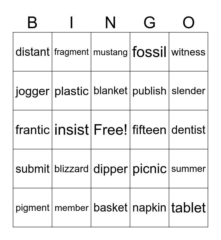 This bingo card has a free space and 24 words: blizzard, member, blanket, pigment, witness, distant, jogger, fragment, fifteen, dipper, publish, frantic, picnic, summer, plastic, napkin, dentist, mustang, slender, insist, tablet, submit, fossil and basket.