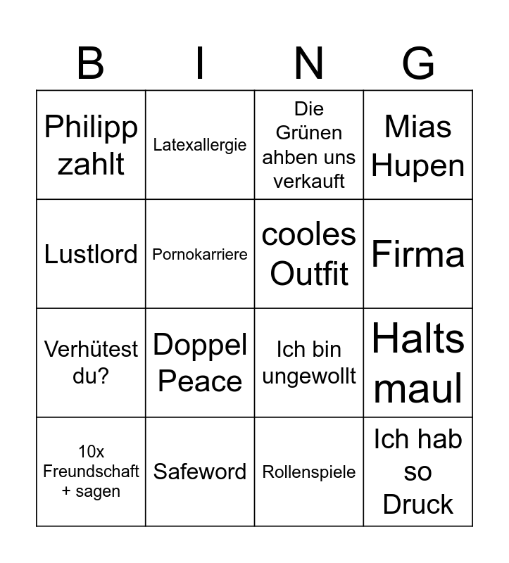 This bingo card has 16 words: Safeword, Halts maul, Die Grünen ahben uns verkauft, Philipp zahlt, Verhütest du?, Latexallergie, Ich bin ungewollt, Rollenspiele, Lustlord, Pornokarriere, 10x Freundschaft + sagen, Mias Hupen, Doppel Peace, Firma, cooles Outfit and Ich hab so Druck.