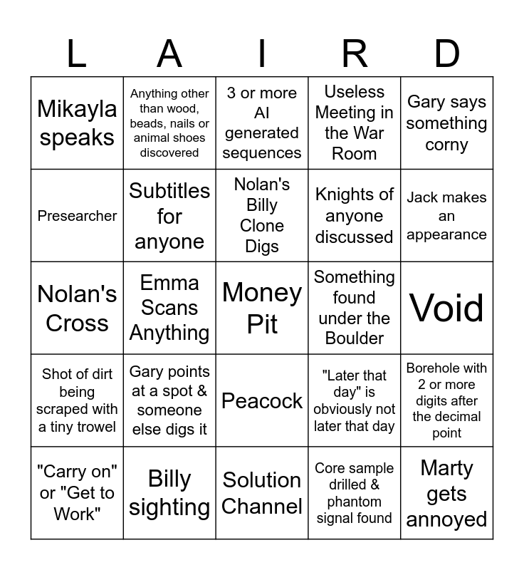 This bingo card has a free space and 24 words: Gary points at a spot & someone else digs it, Billy sighting, Nolan's Billy Clone Digs, "Carry on" or "Get to Work", Gary says something corny, Mikayla speaks, Presearcher, Anything other than wood, beads, nails or animal shoes discovered, Something found under the Boulder, Peacock, Knights of anyone discussed, Nolan's Cross, "Later that day" is obviously not later that day, Borehole with 2 or more digits after the decimal point, Subtitles for anyone, Core sample drilled & phantom signal found, Void, 3 or more AI generated sequences, Jack makes an appearance, Emma Scans Anything, Marty gets annoyed, Shot of dirt being scraped with a tiny trowel, Useless Meeting in the War Room and Solution Channel.