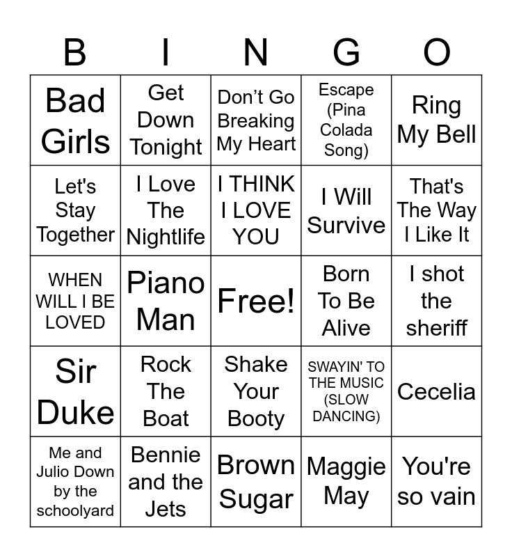 This bingo card has a free space and 94 words: Staying alive, September, Brown Sugar, Old Time Rock and Roll, You Sexy Thing, It's not unusual, One Way or Another, Me and Julio Down by the schoolyard, American Pie, Night Fever, Boogie Oogie Oogie, Shadow Dancing, Dancing Queen, I Will Survive, Best Of My Love, Ring My Bell, Don’t Go Breaking My Heart, Bad, Bad Leroy Brown, Bohemian Rhapsody, Y.M.C.A., Disco Inferno, We Are Family, Funky Town, Last Dance, Rock The Boat, I Love The Nightlife, Kung Fu Fighting, December 1963, My Sharona, Hooked on a Feeling, Bennie and the Jets, Shake Your Booty, Love will keep us together, Hotel California, Get Down Tonight, SOME KIND OF WONDERFUL, I LOVE A RAINY NIGHT, KNOCK 3 TIMES, I THINK I LOVE YOU, SWAYIN' TO THE MUSIC (SLOW DANCING), WHEN WILL I BE LOVED, Sir Duke, I shot the sheriff, The Joker, You're so vain, crocodile rock, Love Train, You make me feel like dancing, Thank god I'm a country boy., Bette Davis Eyes, Jive Talkin' Bee Gees, Maggie May, Philadelphia Freedom, Let Your Love Flow', Still the One, Hold the Line, Only the Good Die Young, Drift Away, You're the One That I Want, My Best Friend's Girl, Piano Man, Play That Funky Music, Signed, Sealed, Delivered, Summer Nights, ABC, Da Ya Think Im Sexy?, Lean on Me, Isn't She Lovely, Let's Stay Together, You Ain't Seen Nothing Yet, Life In The Fast Lane, Beast Of Burden, Brick House, Brandy (You're A Fine Girl), Escape (Pina Colada Song), More Than A Feeling, Let's Get It On, That's The Way I Like It, Cecelia, She's A Lady, You Should Be Dancing, Grease, Can't Get Enough Of Your Love Baby, Born To Be Alive, Bad Girls, Werewolves of London, Cat's In The Cradle, Joy to the World, Come and Get Your Love, Mandy, Paradise by the dashboard lights, Tie a Yellow Ribbon 'Round the old oak tree, Brown Eyed Girl and Rapper’s Delight.