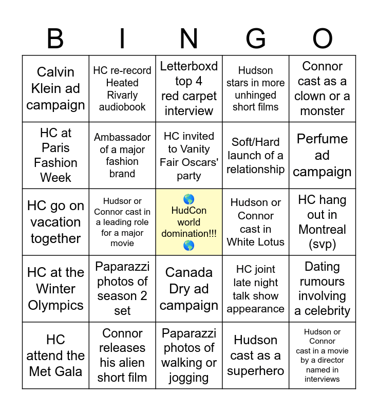 This bingo card has a free space and 24 words: Paparazzi photos of season 2 set, Connor releases his alien short film, HC invited to Vanity Fair Oscars' party, HC attend the Met Gala, Connor cast as a clown or a monster, Calvin Klein ad campaign, HC at Paris Fashion Week, HC re-record Heated Rivarly audiobook, Hudson or Connor cast in White Lotus, Canada Dry ad campaign, Soft/Hard launch of a relationship, HC go on vacation together, HC joint late night talk show appearance, Dating rumours involving a celebrity, Ambassador of a major fashion brand, Hudson cast as a superhero, HC hang out in Montreal (svp), Letterboxd top 4 red carpet interview, Perfume ad campaign, Hudsor or Connor cast in a leading role for a major movie, Hudson or Connor cast in a movie by a director named in interviews, HC at the Winter Olympics, Hudson stars in more unhinged short films and Paparazzi photos of walking or jogging.