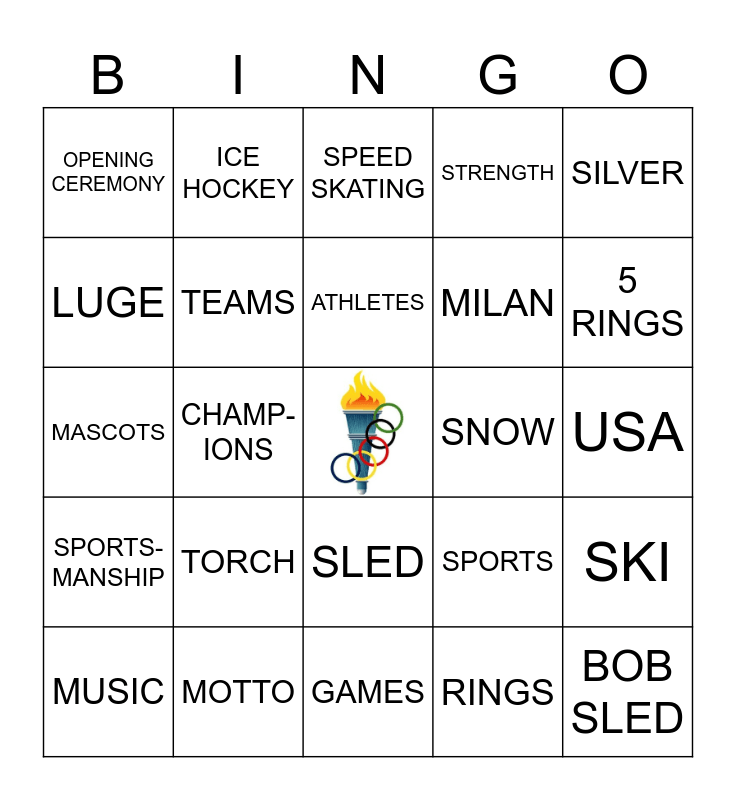 This bingo card has a free space and 50 words: THEME, MOTTO, GREECE, RINGS, SKI, SKATE, ICE HOCKEY, ITALY, MILAN, MEDALS, LUGE, TEAMS, SPORTS, BOB SLED, CURLING, MEN, SPEED SKATING, SNOW, CORTINA, OPENING CEREMONY, TORCH, GAMES, STRENGTH, 5 RINGS, GOLD, CLOSING CEREMONY, ATHLETES, BRONZE, SILVER, SPORTS- MANSHIP, ALPINE SKIING, FIGURE SKATING, TEAM WORK, JUDGES, SKI JUMPING, NEW EVENT, FLAGS, COLD, FUN, MASCOTS, MOUNTAINS, STOATS, SPEED, JUMPS, MUSIC, CHAMP- IONS, SLED, AUDIENCE, USA and WOMEN.