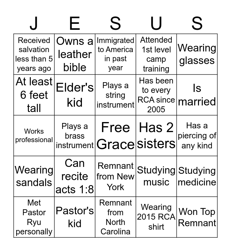 This bingo card has a free space and 24 words: Can recite acts 1:8, Pastor's kid, Plays a string instrument, Met Pastor Ryu personally, Wearing glasses, Received salvation less than 5 years ago, At least 6 feet tall, Owns a leather bible, Has 2 sisters, Remnant from New York, Has been to every RCA since 2005, Works professional, Studying music, Studying medicine, Elder's kid, Wearing 2015 RCA shirt, Has a piercing of any kind, Immigrated to America in past year, Is married, Plays a brass instrument, Won Top Remnant, Wearing sandals, Attended 1st level camp training and Remnant from North Carolina.