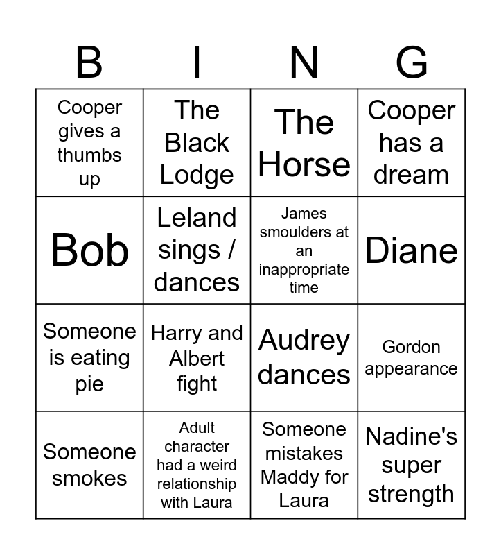 This bingo card has 24 words: Laura Palmers Theme plays, Someone is having an affair, Diane, Andy cries, Bob, Cooper gives a thumbs up, Leland sings / dances, The Black Lodge, Adult character had a weird relationship with Laura, Someone is drinking coffee, Someone is eating pie, Audrey dances, The owls, Log Lady says something mysterious, James smoulders at an inappropriate time, Catherine bullies Pete, Someone mistakes Maddy for Laura, The Horse, Harry and Albert fight, Gordon appearance, Someone smokes, Nadine's super strength, Cooper has a dream and Someone commits a crime.