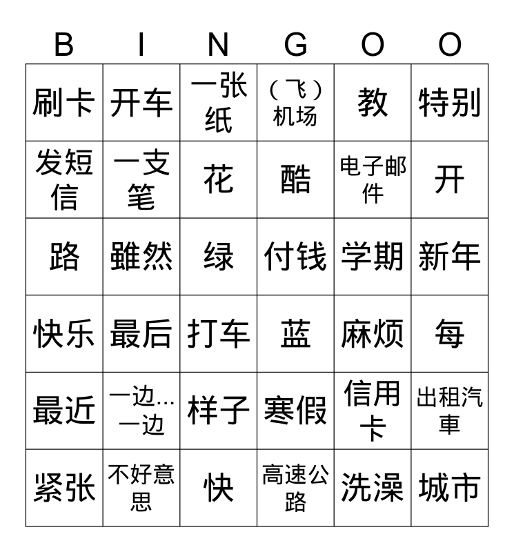 This bingo card has 36 words: 寒假, 样子, 高速公 路, 发短信, 快乐, 付钱, 一支笔, 快, 教, 信用卡, 开, (飞) 机场, 出租汽 車, 雖然, 酷, 刷卡, 最近, 学期, 路, 一张纸, 绿, 最后, 蓝, 打车, 麻烦, 开车, 电子邮 件, 不好意 思, 花, 特别, 城市, 紧张, 每, 新年, 一边... 一边 and 洗澡.