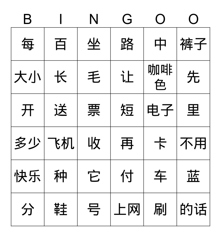 This bingo card has 36 words: 付, 它, 上网, 大小, 多少, 短, 长, 号, 中, 车, 先, 路, 蓝, 送, 让, 每, 快乐, 电子, 开, 坐, 票, 飞机, 再, 收, 卡, 百, 咖啡色, 鞋, 毛, 裤子, 的话, 分, 不用, 里, 种 and 刷.