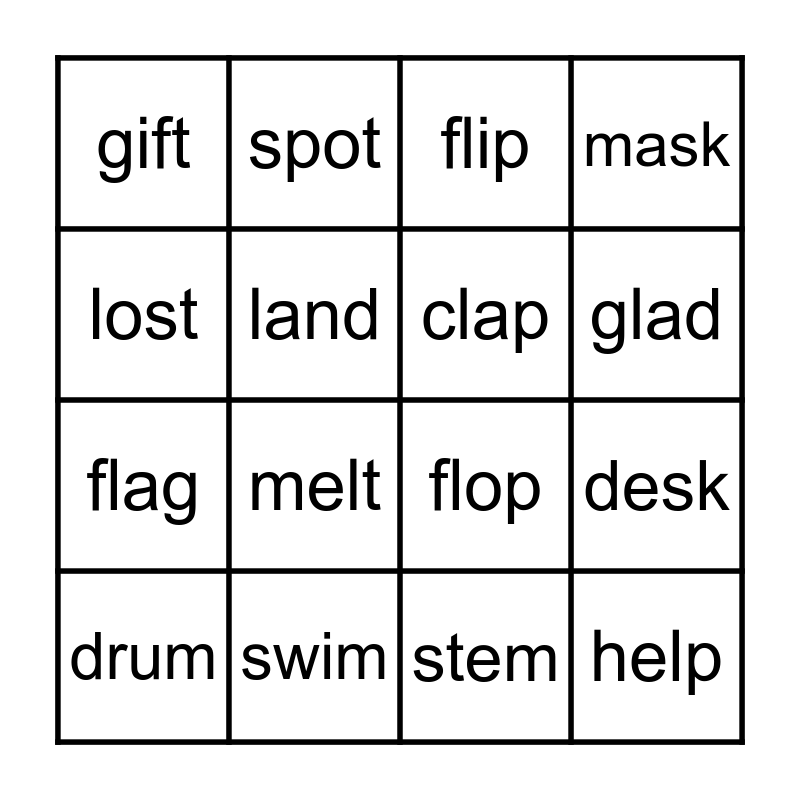 This bingo card has 16 words: swim, desk, flip, gift, flag, spot, flop, stem, lost, land, drum, mask, melt, glad, clap and help.