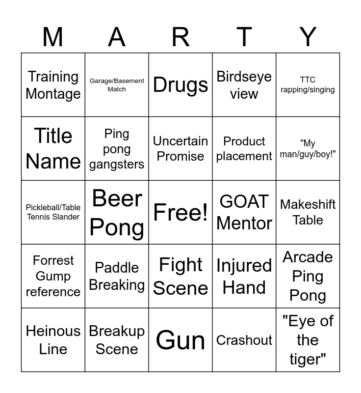 This bingo card has a free space and 24 words: Paddle Breaking, Breakup Scene, Uncertain Promise, Heinous Line, TTC rapping/singing, Training Montage, Title Name, Garage/Basement Match, GOAT Mentor, Fight Scene, Product placement, Pickleball/Table Tennis Slander, Injured Hand, Arcade Ping Pong, Ping pong gangsters, Crashout, Makeshift Table, Drugs, "My man/guy/boy!", Beer Pong, "Eye of the tiger", Forrest Gump reference, Birdseye view and Gun.