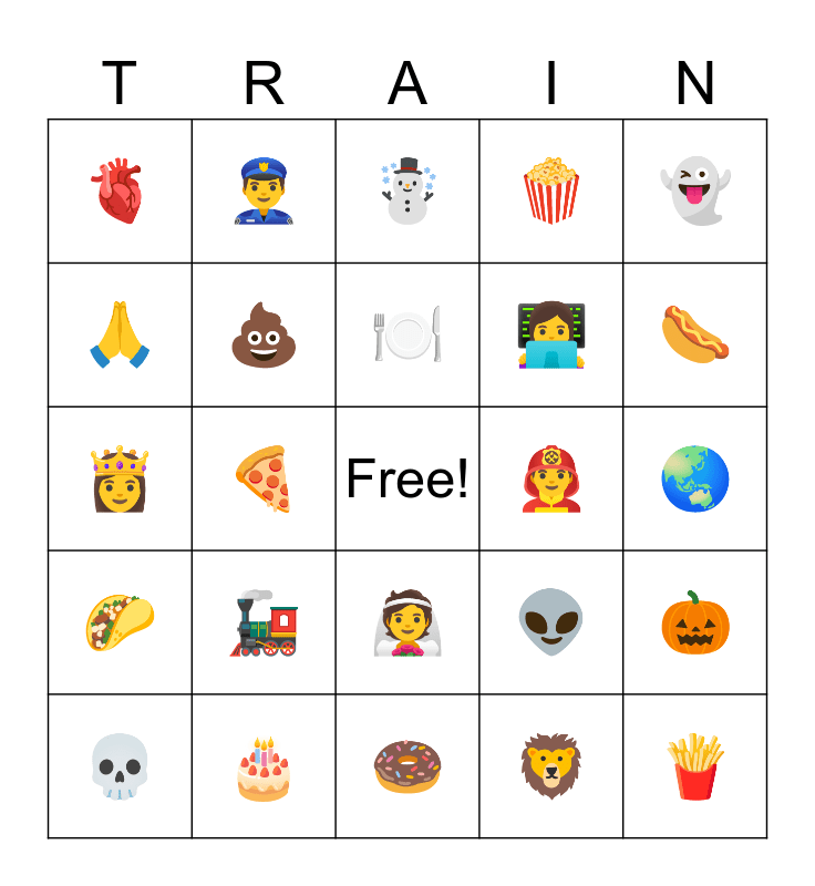 This bingo card has a free space and 24 words: 🚂, 🎂, 🍽, 💀, 👻, 🫀, 🙏, 👮♂️, 👨🚒, 👰, 👩💻, 👸, 👽, 🎃, 💩, 🦁, 🌏, ☃️, 🌭, 🍕, 🍟, 🌮, 🍿 and 🍩.