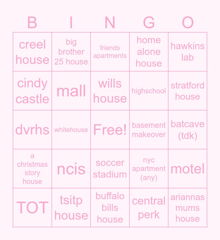 This bingo card has a free space and 24 words: ncis, tsitp house, wills house, TOT, hawkins lab, creel house, cindy castle, big brother 25 house, basement makeover, soccer stadium, highschool, dvrhs, nyc apartment (any), motel, mall, central perk, batcave (tdk), friends apartments, stratford house, whitehouse, ariannas mums house, a christmas story house, home alone house and buffalo bills house.