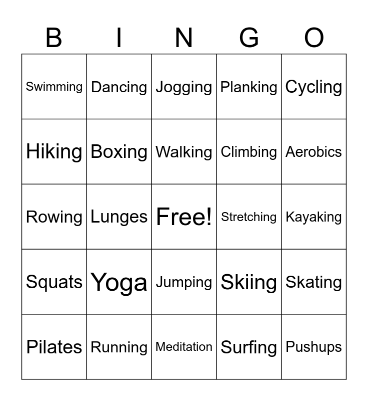 This bingo card has a free space and 24 words: Yoga, Running, Walking, Pilates, Cycling, Swimming, Hiking, Dancing, Stretching, Jumping, Climbing, Rowing, Skiing, Skating, Boxing, Surfing, Kayaking, Jogging, Aerobics, Lunges, Pushups, Squats, Planking and Meditation.