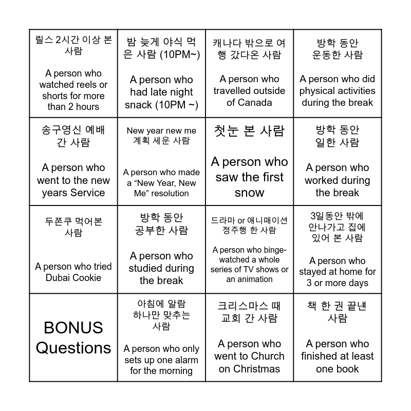 This bingo card has 16 words: 아침에 알람 하나만 맞추는 사람 A person who only sets up one alarm for the morning, 3일동안 밖에 안나가고 집에 있어 본 사람 A person who stayed at home for 3 or more days, 캐나다 밖으로 여행 갔다온 사람 A person who travelled outside of Canada, 릴스 2시간 이상 본 사람 A person who watched reels or shorts for more than 2 hours, 두쫀쿠 먹어본 사람 A person who tried Dubai Cookie, 밤 늦게 야식 먹은 사람 (10PM~) A person who had late night snack (10PM ~), 드라마 or 애니매이션 정주행 한 사람 A person who binge-watched a whole series of TV shows or an animation, 크리스마스 때 교회 간 사람 A person who went to Church on Christmas, 송구영신 예배 간 사람 A person who went to the new years Service, New year new me 계획 세운 사람 A person who made a “New Year, New Me” resolution, BONUS Questions, 방학 동안 운동한 사람 A person who did physical activities during the break, 방학 동안 공부한 사람 A person who studied during the break, 방학 동안 일한 사람 A person who worked during the break, 첫눈 본 사람 A person who saw the first snow and 책 한 권 끝낸 사람 A person who finished at least one book.