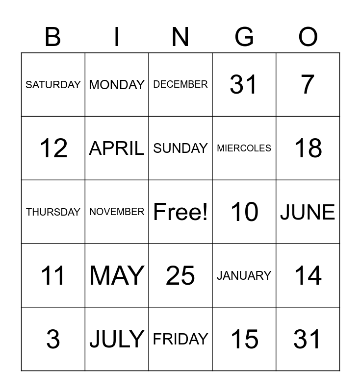 This bingo card has a free space and 24 words: 3, MAY, SUNDAY, 15, 7, SATURDAY, MONDAY, DECEMBER, 10, JUNE, THURSDAY, APRIL, JANUARY, 14, 12, JULY, FRIDAY, 31, 18, 11, NOVEMBER, 25, MIERCOLES and 31.