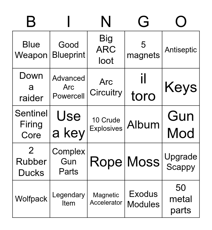 This bingo card has 34 words: 50 metal parts, Exodus Modules, Advanced Electrical Components, Epic Weapon, 2 Rubber Ducks, Advanced Arc Powercell, Antiseptic, Wolfpack, Good Blueprint, Lance's Mixtape, Arc Circuitry, Big ARC loot, Arc Coolant, 15 ARC Alloys, Album, Keys, Legendary Item, Sentinel Firing Core, Complex Gun Parts, Moss, Rope, Mod Components, Blue Weapon, Gun Mod, Magnetic Accelerator, 10 Crude Explosives, 5 magnets, Anvil, il toro, Down a raider, Kill a big arc, Use a key, Upgrade Scappy and 3 Durable Cloth.