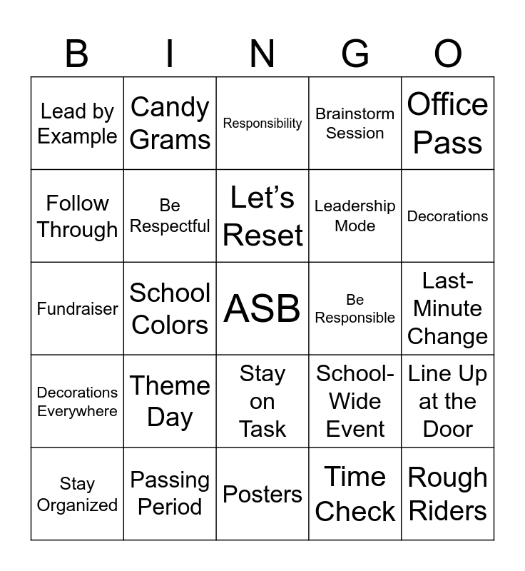 This bingo card has a free space and 83 words: Leadership, Teamwork, Responsibility, Respect, Inclusion, Unity, Accountability, Communication, Organization, Problem Solving, Initiative, Be Kind, Be Respectful, Be Responsible, Be Safe, Lead by Example, Stay Organized, Follow Through, Be On Time, Student Council, ASB Life, Leadership Mode, Rough Riders, School Pride, School Colors, School Mascot, Spirit Week, Spirit Assembly, Pep Rally, Free Dress Day, Theme Day, Spirit Wear, Event Planning, Fundraiser, Assembly, Voting, Posters, Announcements, Decorations, Decorations Everywhere, Set-Up Crew, Clean-Up Crew, Behind the Scenes, Lunchtime Activity, After-School Event, Dance Planning, Candy Grams, Photo Booth, Music at Lunch, Lunchtime Music, School-Wide Event, Brainstorm Session, Last-Minute Change, Run It Back, Group Chat, Theme Reveal, We’ve Got This, Morning Announcements, Passing Period, Lunch Bell, Minimum Day, Advisory, Homework Reminder, Office Pass, Late Slip, Line Up at the Door, Borrow a Pencil, Lost Water Bottle, Chromebook Charged, Someone Forgot the Poster, What Period Is This?, Do the Right Thing, Check the Calendar, Stay on Task, Time Check, Quiet Signal, Eyes Up Front, Let’s Reset, School Fun, Unity in Action, Rough Rider Energy, Rough Rider Strong and ASB PRIDE.