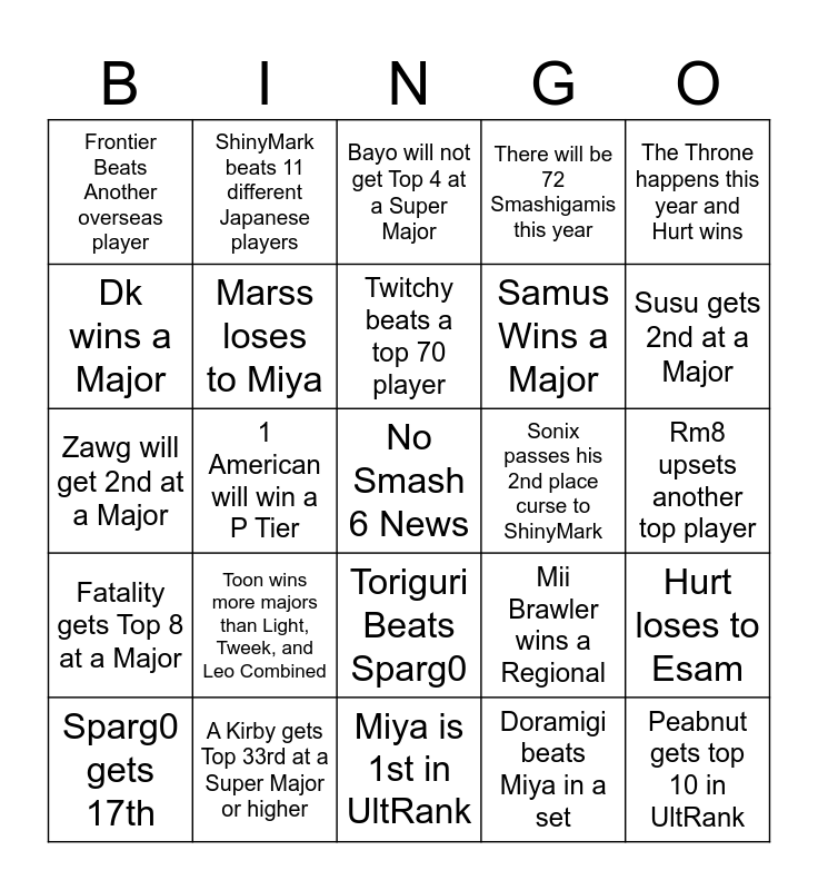 This bingo card has a free space and 24 words: Toon wins more majors than Light, Tweek, and Leo Combined, A Kirby gets Top 33rd at a Super Major or higher, Twitchy beats a top 70 player, Sparg0 gets 17th, The Throne happens this year and Hurt wins, Frontier Beats Another overseas player, Dk wins a Major, ShinyMark beats 11 different Japanese players, Sonix passes his 2nd place curse to ShinyMark, Toriguri Beats Sparg0, Samus Wins a Major, Zawg will get 2nd at a Major, Mii Brawler wins a Regional, Hurt loses to Esam, Marss loses to Miya, Doramigi beats Miya in a set, Rm8 upsets another top player, Bayo will not get Top 4 at a Super Major, Susu gets 2nd at a Major, 1 American will win a P Tier, Peabnut gets top 10 in UltRank, Fatality gets Top 8 at a Major, There will be 72 Smashigamis this year and Miya is 1st in UltRank.
