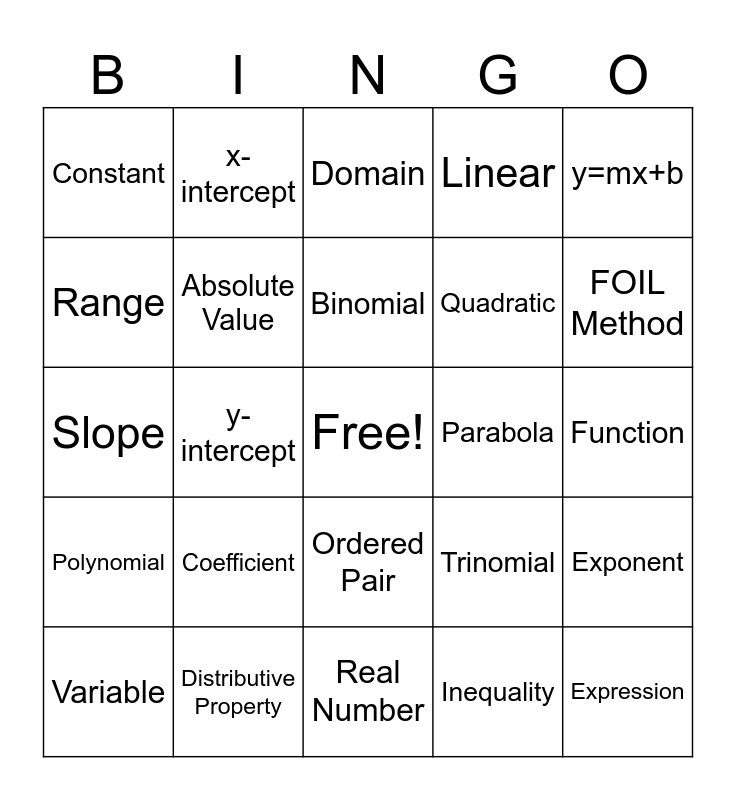 This bingo card has a free space and 24 words: Variable, Coefficient, Binomial, Inequality, y=mx+b, Constant, x-intercept, Domain, Parabola, Function, Slope, Absolute Value, Trinomial, Exponent, Range, Distributive Property, Real Number, Linear, FOIL Method, Polynomial, y-intercept, Ordered Pair, Quadratic and Expression.