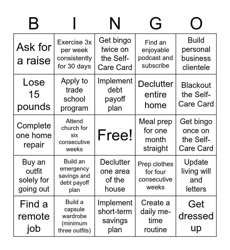 This bingo card has a free space and 25 words: Build an emergency savings and debt payoff plan, Implement short-term savings plan, Implement debt payoff plan, Find a remote job, Build personal business clientele, Ask for a raise, Lose 15 pounds, Exercise 3x per week consistently for 30 days, Meal prep for one month straight, Declutter one area of the house, Declutter entire home, Complete one home repair, Prep clothes for four consecutive weeks, Update living will and letters, Apply to trade school program, Obtain project management certification, Get bingo once on the Self-Care Card, Get bingo twice on the Self-Care Card, Blackout the Self-Care Card, Attend church for six consecutive weeks, Get dressed up, Build a capsule wardrobe (minimum three outfits), Buy an outfit solely for going out, Find an enjoyable podcast and subscribe and Create a daily me-time routine.