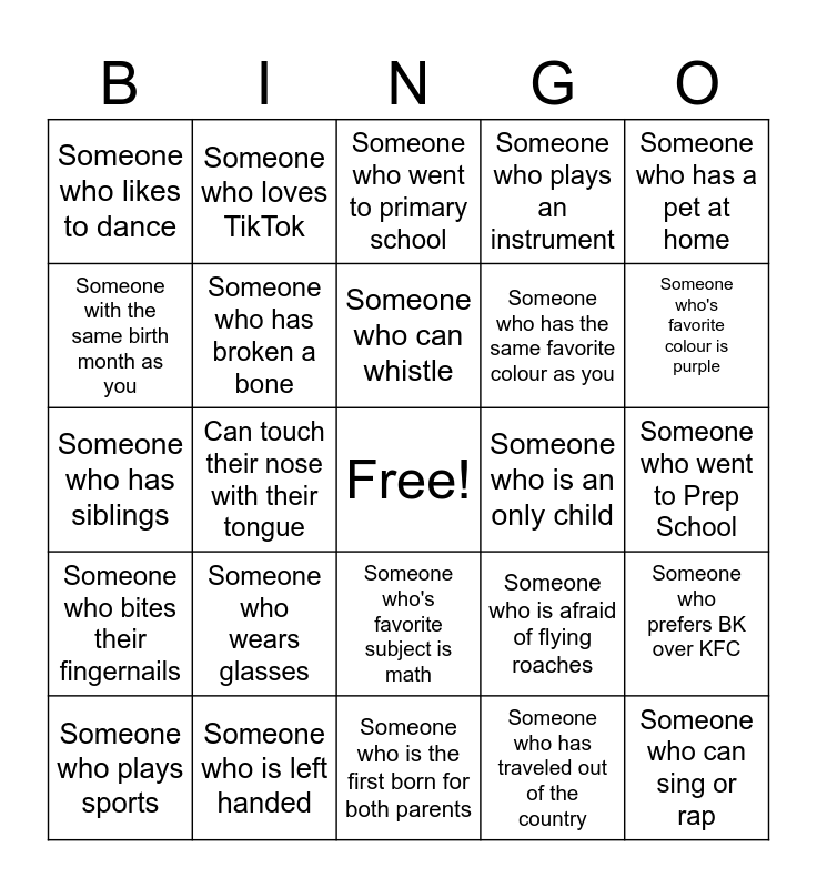 This bingo card has a free space and 24 words: Someone who wears glasses, Someone who is left handed, Someone who can whistle, Someone who plays sports, Someone who has a pet at home, Someone who likes to dance, Someone with the same birth month as you, Someone who loves TikTok, Someone who is an only child, Someone who's favorite subject is math, Someone who has the same favorite colour as you, Someone who has siblings, Someone who is afraid of flying roaches, Someone who prefers BK over KFC, Someone who has broken a bone, Someone who has traveled out of the country, Someone who went to Prep School, Someone who went to primary school, Someone who's favorite colour is purple, Can touch their nose with their tongue, Someone who can sing or rap, Someone who bites their fingernails, Someone who plays an instrument and Someone who is the first born for both parents.