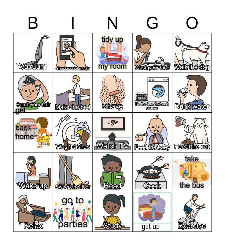 This bingo card has 39 images, a free space and 37 words: Brush your hair, Listen to music, Get dressed, Make the bed, Relax, Read, Shave, Sleep, Walk the dog, Wake up, Wash dishes, Wash your face, Exercise, Feed the cat, Feed the baby, Sweep the floor, Take a shower, Vacuum, Brush your teeth, Cook, Comb your hair, Study, Do the laundry/wash clothes, Drink water, Eat breakfast, Eat dinner, Go to school, Go to work, Pack your lunch, Check social media, workout, ride a bike, tidy up my room, go to parties, take a nap, take the bus and get back home.