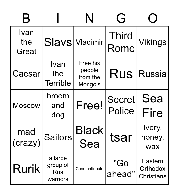 This bingo card has a free space and 24 words: Sailors, a large group of Rus warriors, Free his people from the Mongols, Rurik, Vikings, Ivan the Great, Caesar, Slavs, Secret Police, Black Sea, Rus, Moscow, tsar, Ivory, honey, wax, Ivan the Terrible, "Go ahead", Sea Fire, Vladimir, Russia, broom and dog, Eastern Orthodox Christians, mad (crazy), Third Rome and Constantinople.